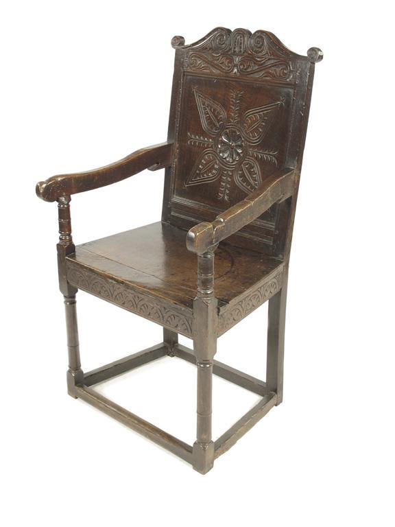 An oak armchair, the leaf and scroll carved top rail to a panelled back with a central rosette and stylized leaves, the solid seat to a lunette carved frieze on turned supports united by peripheral stretchers.