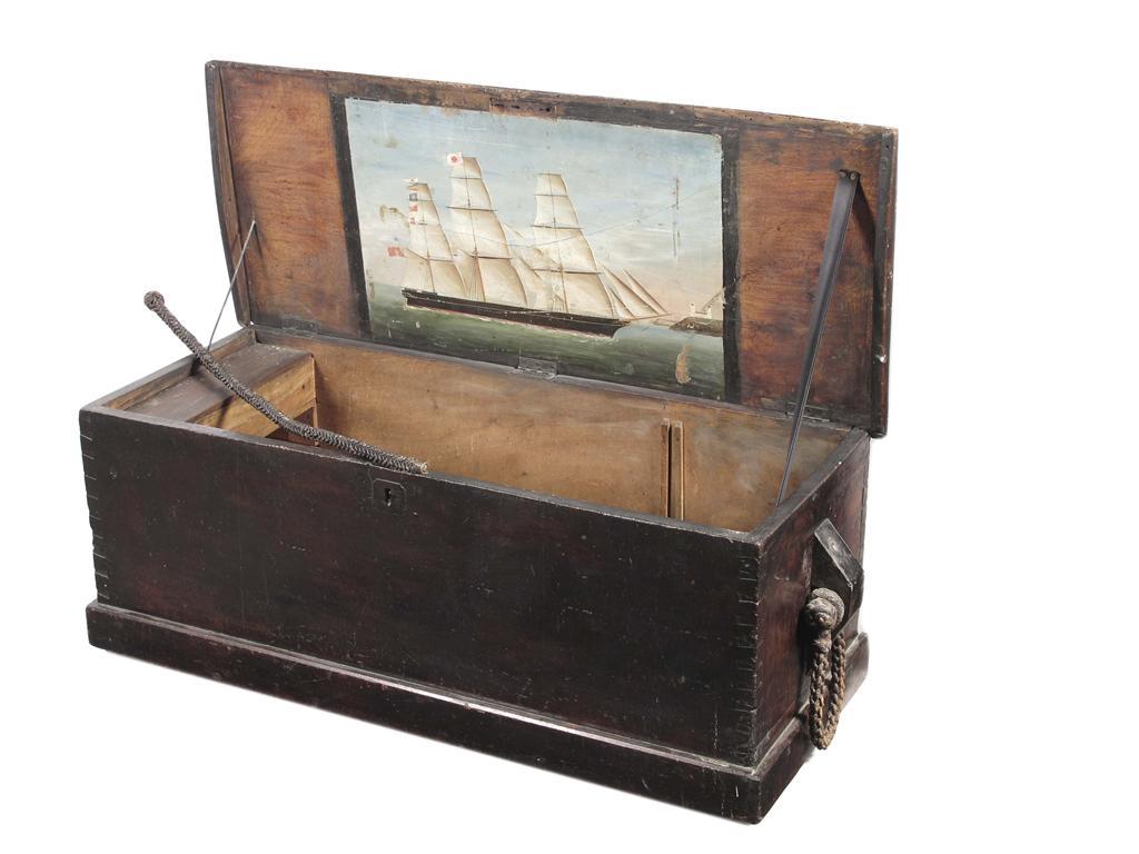 A camphorwood seaman's chest, the hinged lid painted a picture of a tall ship to a lidded candle box, the brass lock stamped 'HARPER & CO.', with rope side carrying handles, 17.5in (44cm) h, 44in (112cm) w, 18in (45.7cm) d, together with a knotted wire walking cane. (2)