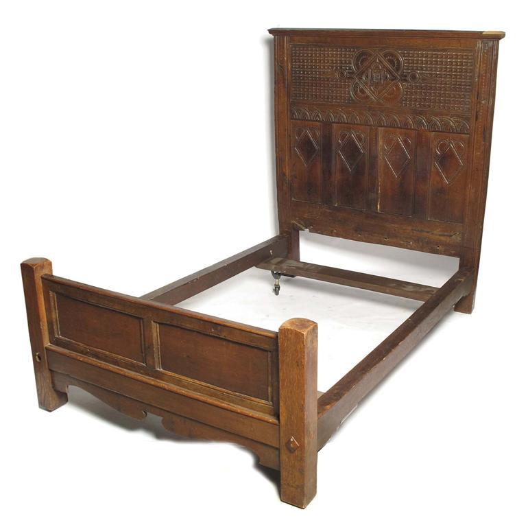 An oak bedstead, the headboard carved with geometric and thumbnail decoration above a band of lunettes and four diamond panels, with a Heal's base, on castors, 17th century elements, 65in (165cm) h, 55in (141.5cm) w, 83.75in (212.3cm) l.