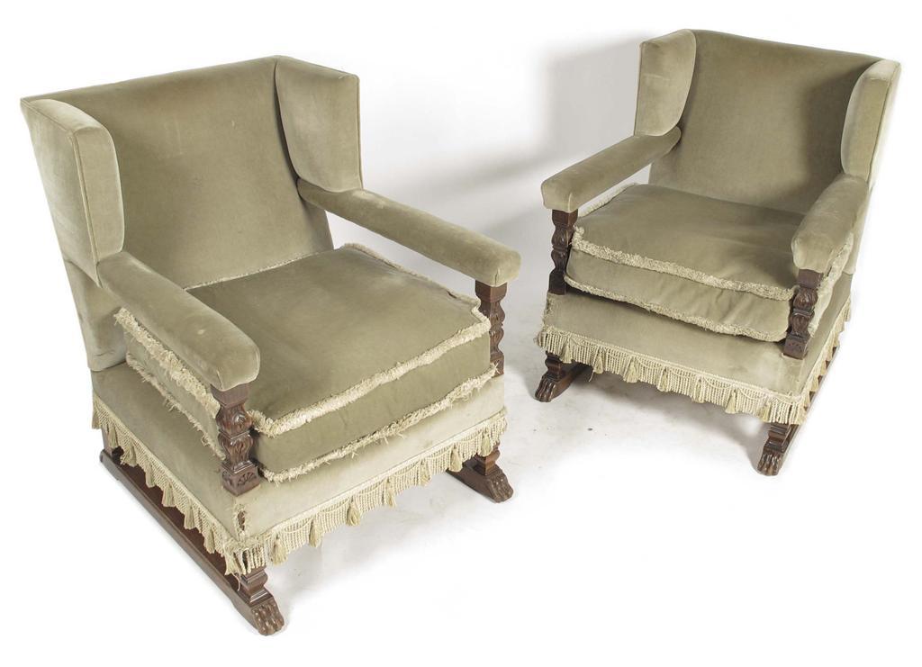 A pair of walnut armchairs, upholstered fringed plush fabric, on leaf carved supports, on stretchered paw front feet, late 19th/ early 20th century. (2)