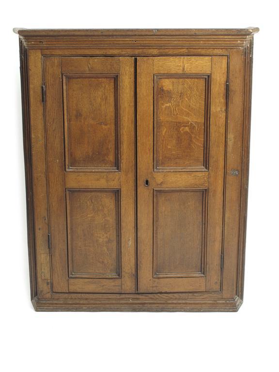 A George III oak hanging corner cupboard, with a pair of twin panelled doors enclosing two shaped shelves, 44.5in (112.7cm) h, 36.5in (92.7cm) w, 19.5in (49.7cm) d. Two sections of cornice replaced.