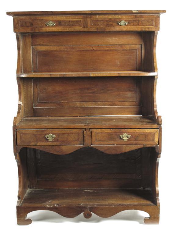 An unusual West Country walnut dresser, with a false drawer lift-off canopy revealing a compartment, above a shelf with a panelled back, the open base with a pair of frieze drawers, shaped supports to a serpentine apron, 19th century and later, 60.5in (153.5cm) h, 43.75in (111cm) w, 14.75in (37.5cm) d.
