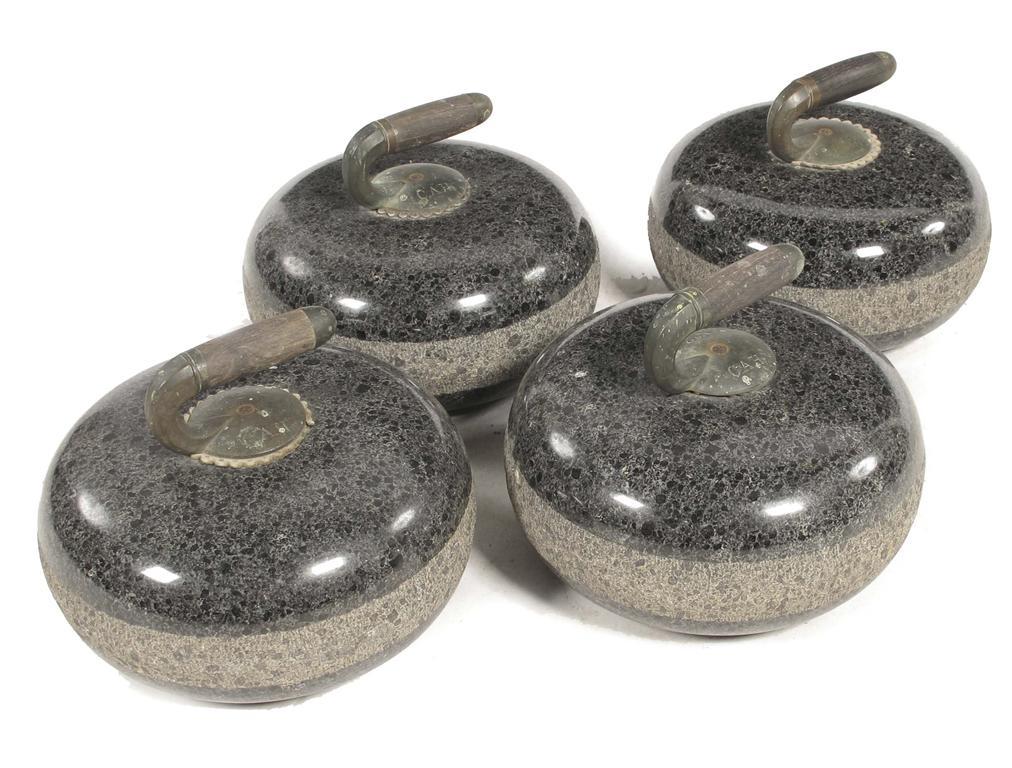 A set of four Scottish granite curling stones, each with a brass and hardwood handle inscribed with initials 'C.A.H.' and two with 'No. 1' and two with 'No. 2', 10in (25.2cm) dia. (4)