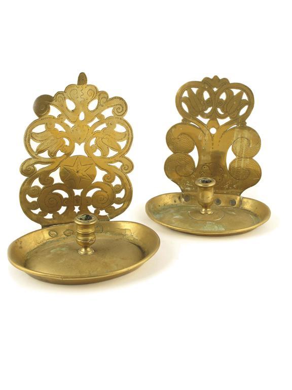 Two brass candle sconces, with oval bases and pierced and engraved back plates, 9.75in (25cm) h. (2)