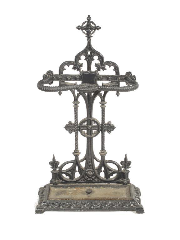 A cast iron stickstand, in Gothic style with a rope twist support and a lift-out tray, 32.5in (82.5cm) h, 18.5in (47cm) w, 7.75in (19.5cm) d.