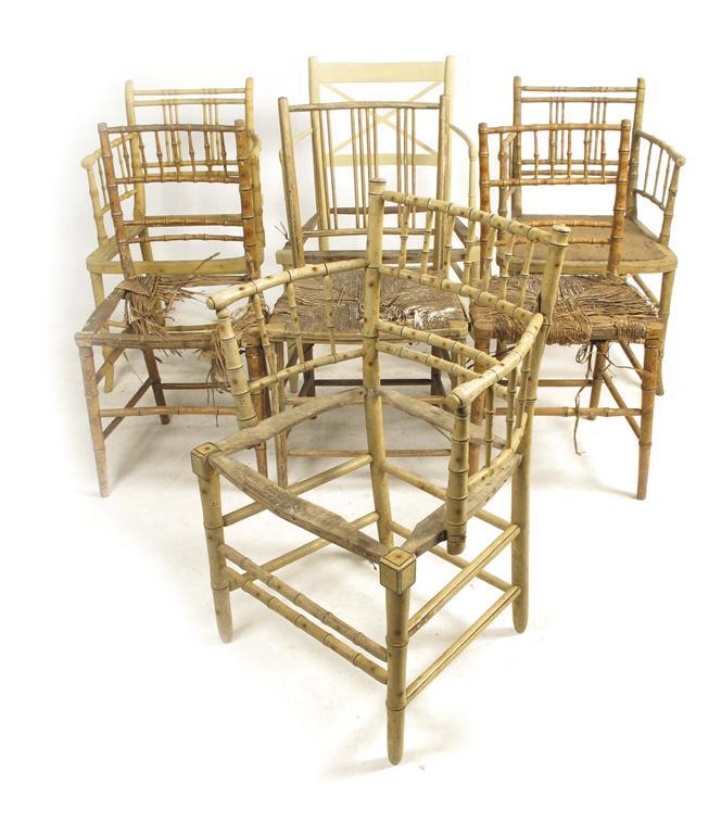 Seven painted faux bamboo chairs, comprising a pair of side chairs, four open armchairs and a single side chair, 19th century and later. (7) Damages, four lacking seats.