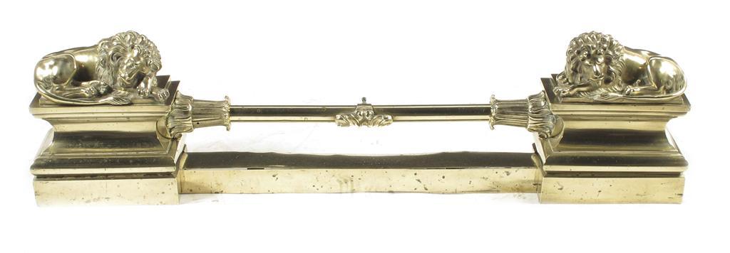 A French Louis Phillipe polished brass adjustable fender, each end modelled with a recumbent lion, the central bar with lappet mounts, 10.5in (26.3cm) h, 54in (137cm) extended.