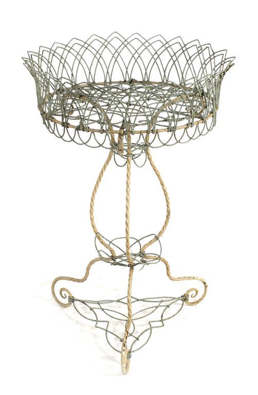 A painted wirework plant stand, on tripod supports, 32in (81.5cm) h, 21in (53cm) dia.