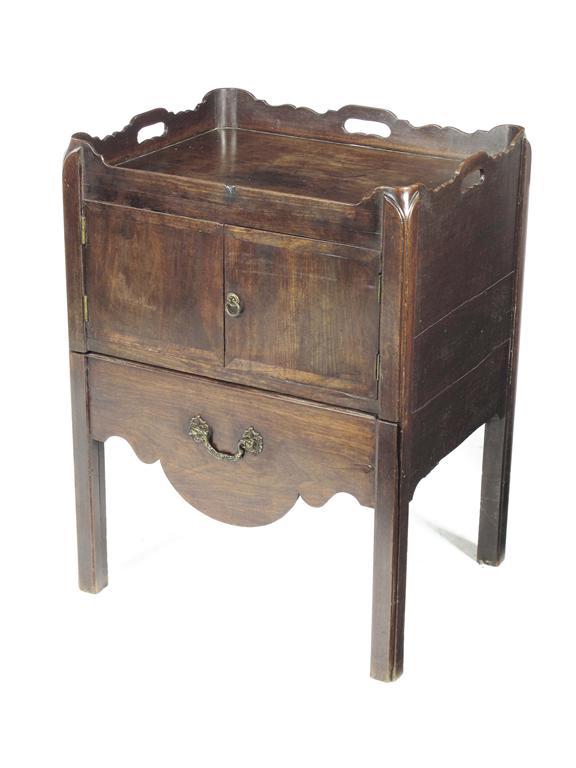 A George III mahogany tray top bedside commode, with three pierced handgrips above a cupboard and a pull-out base, 30in (76cm) h, 27.75in (58cm) w, 18.25in (46.3cm) d.