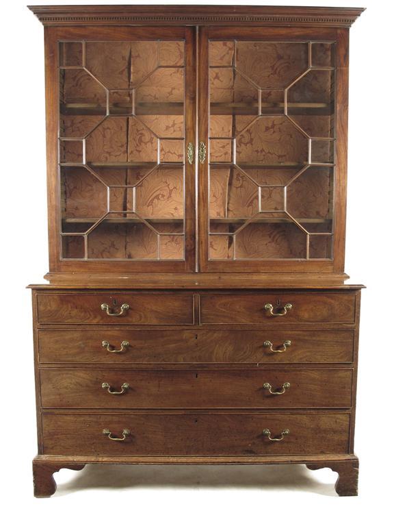 A George III mahogany bookcase on chest, the dentil cornice above a pair of geometric astragal glazed doors enclosing, three adjustable shelves, the base with two short and three long graduated drawers fitted brass swan neck handles on shaped bracket feet, possibly North Country, 88.25in (224cm) h, 61in (154.6cm) w, 22.75in (57.7cm) d.