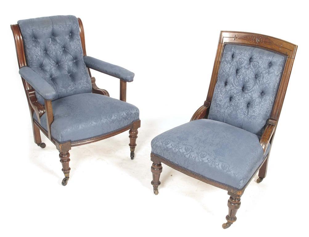 A Victorian mahogany armchair, later upholstered blue fabric, the button back to a bowfront seat and on turned front legs on brass caps and ceramic castors, and a Victorian walnut nursing chair. (2)