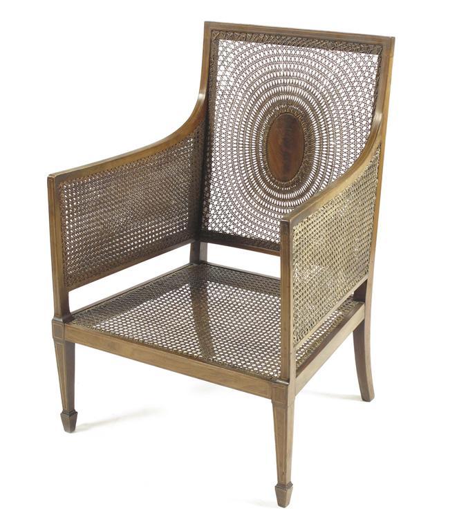 An Edwardian mahogany and boxwood strung bergere armchair, with a central tablet to the radiating caned back, double caned sides on square tapering legs.
