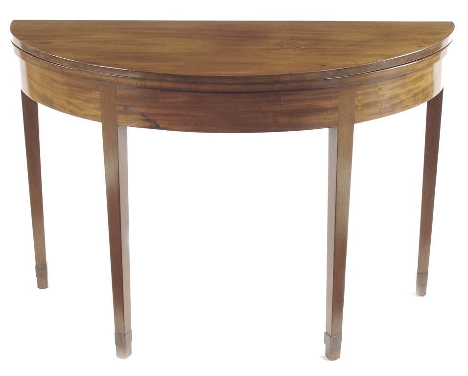 An early 19th century mahogany tea table, with demi-lune hinged top on square tapering legs with applied ankles, 27.75in (70.5cm) h, 42.25in (107.5cm) w, 18.75in (47.5cm) d.