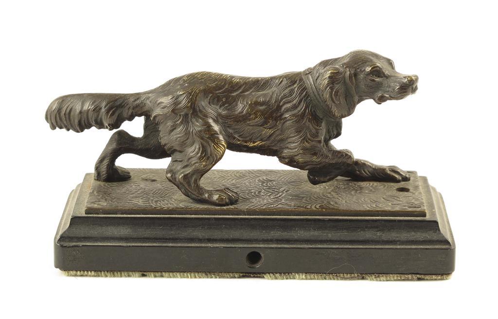 A French bronze Retriever, on a rectangular base, previously wired as a desk bell, 3.25in (8.2cm) h, 5.5in (14cm) w.
