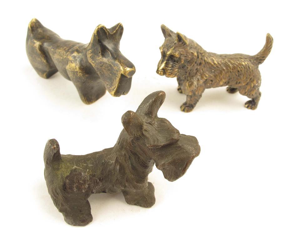A bronze standing Scottie terrier, with a naturalistic coat, 2.25in (5.5cm) h, 2.75in (7cm) l; another bronze Scottie, signed 'TYR 05 1/8'; a cold painted bronze Terrier. (3)