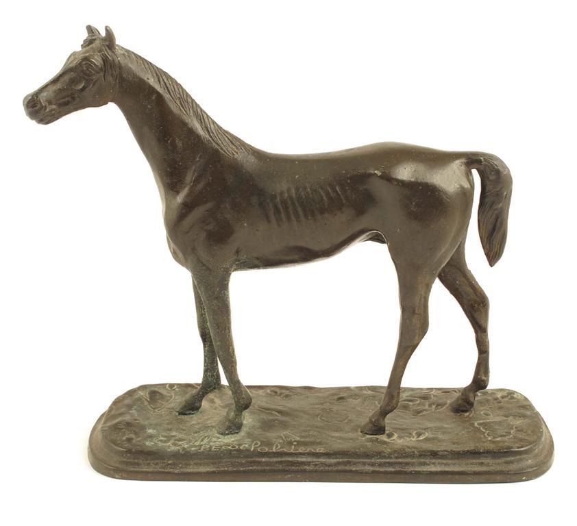 P. E. De Poliere. A bronze thoroughbred horse, standing on a rectangular base, signed, 7in (18cm) h, 7.75in (19.6cm) w.