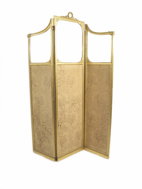 A French giltwood and gesso three fold screen, with glass and fabric panels having a laurel wreath surmount, c.1900, 73.5in (187cm) h 55in (139.5cm) w.