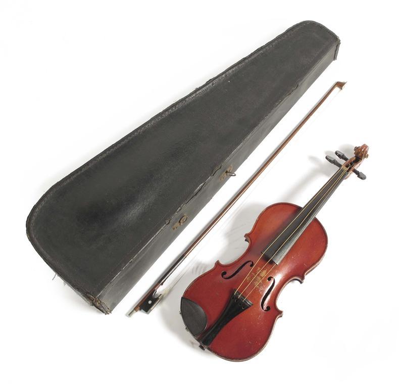 A violin, with a printed paper label inscribed 'MARCUS BERINI, BS&L NO. 4 IN PENCIL 1925', LOB 13in (33.3cm), with a bow, cased.
