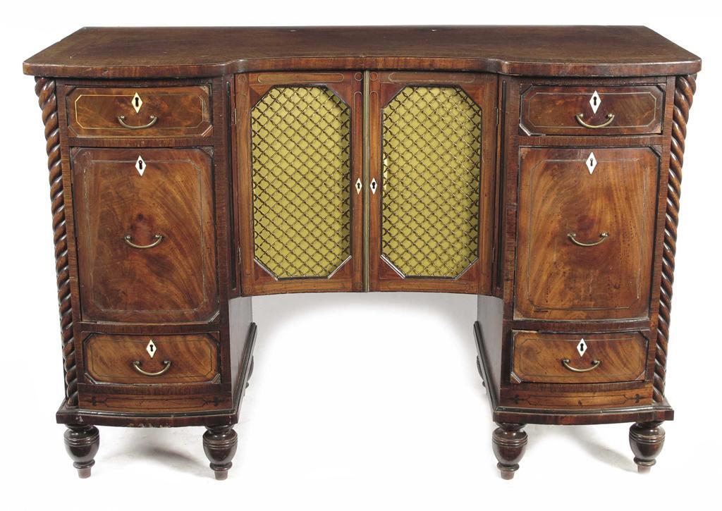 An early 19th century mahogany sideboard, inlaid brass stringing, the rosewood crossbanded inverted breakfront top above a pair of concave gilt metal grille doors enclosing an adjustable shelf, flanked by three drawers to each side, the right deep drawer with divisions for bottles, with ivory escutcheons and spiral twist columns on turned bun feet, the top previously with a suprastructure, 36.75in (93cm) h, 53.75in (136.2cm) w, 23.75in (60cm) d.