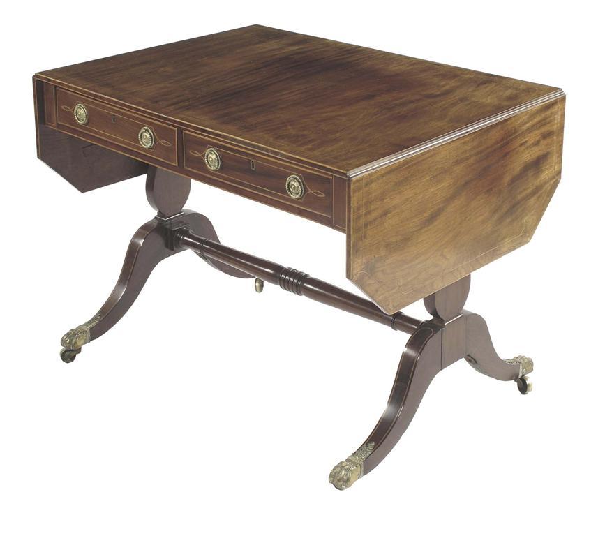 A late Regency mahogany sofa table, inlaid stringing flap-top with canted corners above two frieze drawers fitted replaced brass handles, the false reverse drawers with plugged holes on baluster end supports united by a turned stretcher, scroll legs to brass paw sabots and castors, 27.75in (70.5cm) h, 37in (94cm) w, 27in (68.5cm) d. Old restorations.