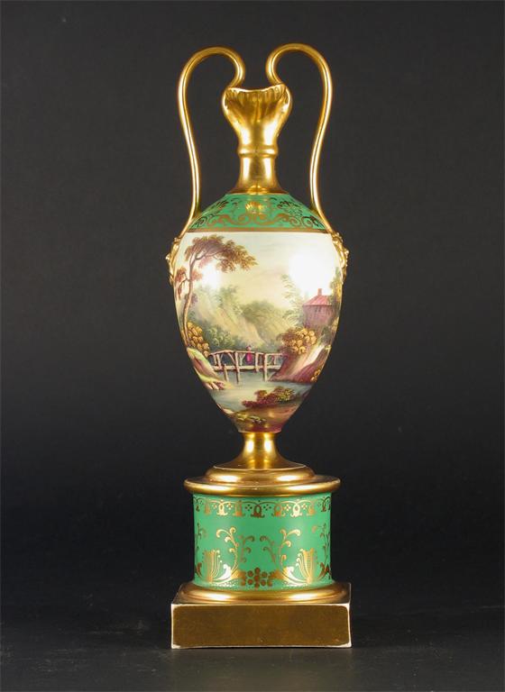 A Minton two-handled Pembroke vase, the body painted with a continuous landscape between richly gilded green borders, c.1825-30, 27.5cm.