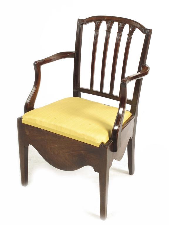 A George III mahogany commode open armchair, the arched top rail to a quadruple column back with stiff leaf capitals to a later drop-in seat on square tapering front legs.