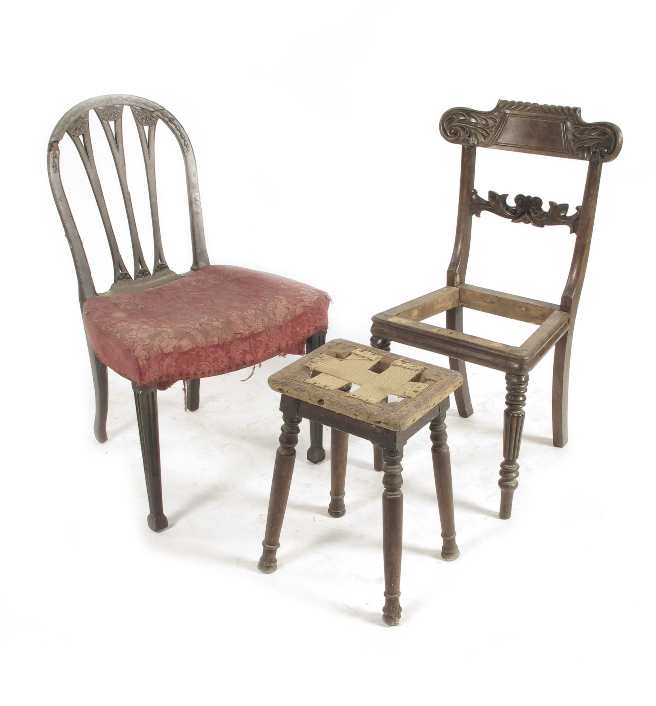 A George III mahogany side chair, a Regency mahogany side chair, a stool and a folding towel airer. (4) Old damages and losses.