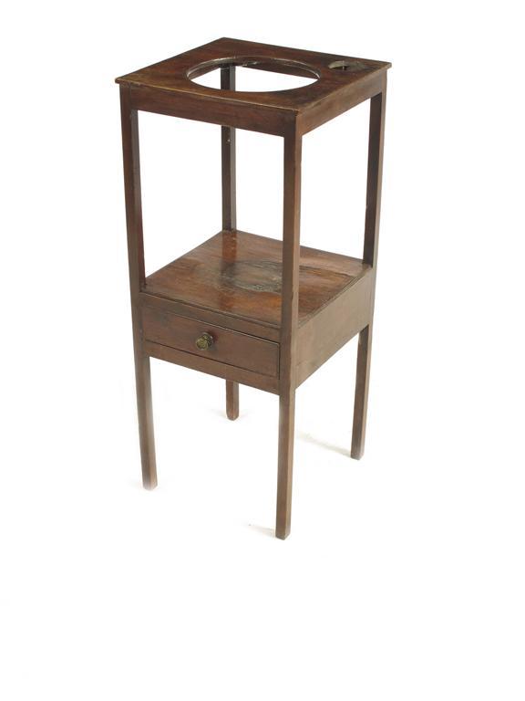 A George III fruitwood square wash stand, the top with pierced bowl apertures and fitted a drawer, 31.5in (79.5cm) h, 13.25in (33.4cm) w, 12.75in (32.4cm) d.