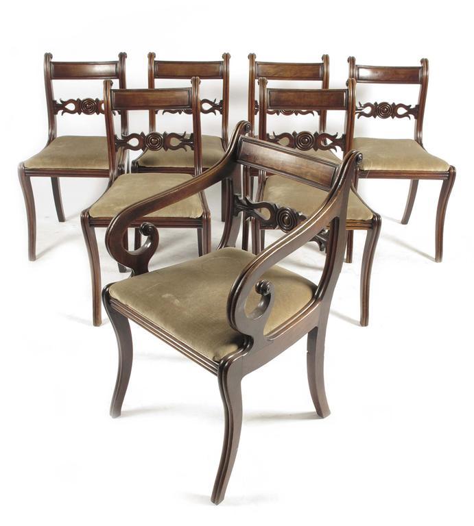 A set of seven early 19th century mahogany dining chairs, each with a curved tablet top rail above a pierced lappet and rondel splat, to a drop-in seat on moulded sabre legs, comprising: an open armchair and six side. (7)