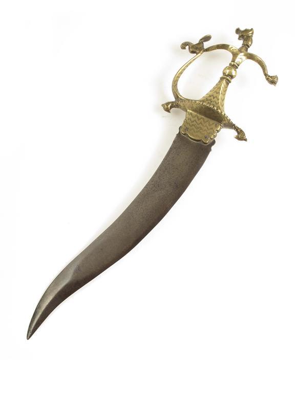 An Indian Chilanum dagger, with a recurving blade and brass handle with lion mask and bird terminals, 16.75in (42.5cm) l.