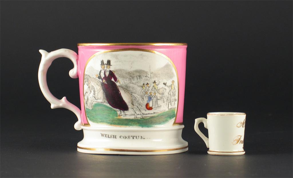 Welsh interest: two porcelain mugs, one decorated with scenes titled 'Welsh Costumes', the miniature inscribed 'A Present from Ponty Pridd'. The larger mug with a body crack. 19th century. (2)