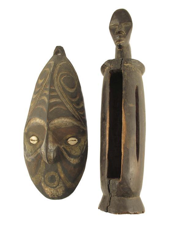 A Papua New Guinea carved and polychrome decorated mask, with cowrie eyes, 12in (30.5cm) h, and an Ivory Coast slit drum, with mask terminal handle, the sides carved lizards. (2)