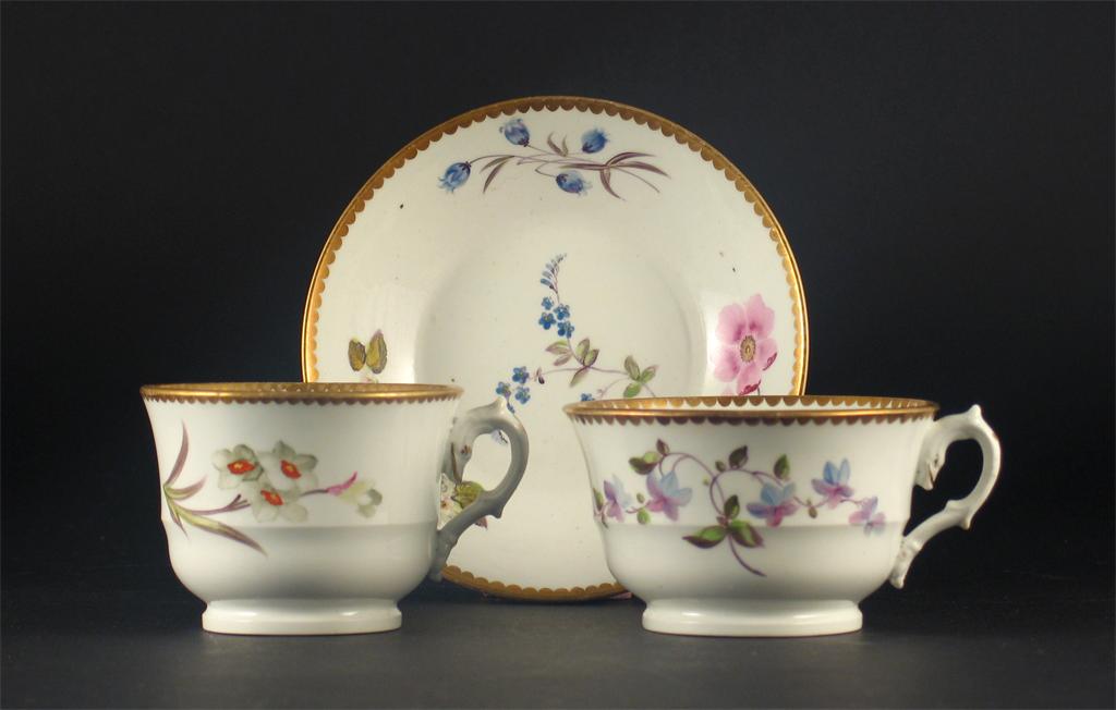 A good porcelain trio, probably Granger Worcester, delicately painted with flowers, within gilt dental borders, pattern No.619, c.1820-30. (3)