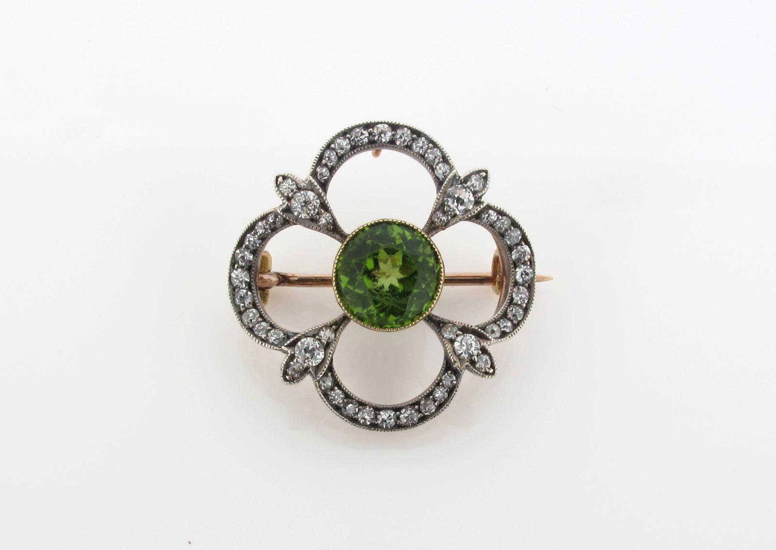 A pair of cultured pearl and diamond drop earrings, the pearls suspend from a yellow gold foliate design centred with a diamond with two smaller diamonds.