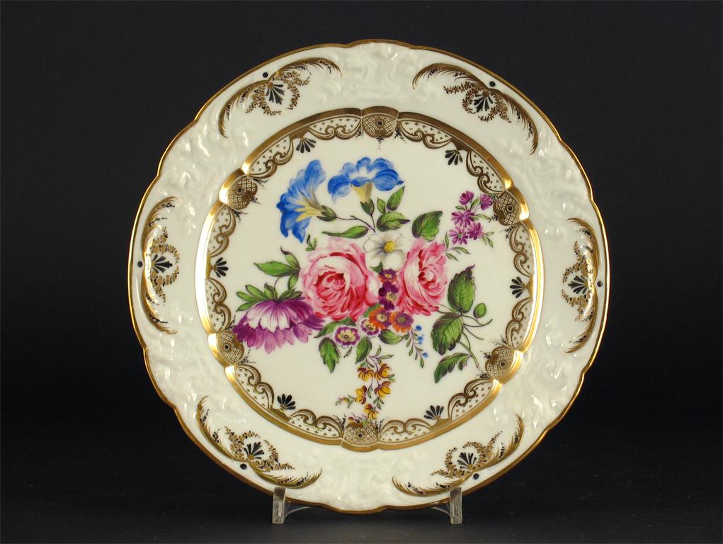 A copy of a Swansea plate, painted with flowers and with gilt border motifs, marked Swansea, late 19th century French, 21cm.
