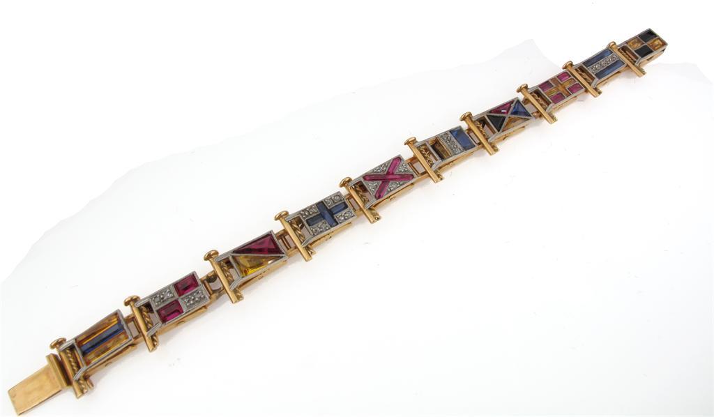 A flexible gold bracelet designed as a row of flags, set with small diamonds, pastes and gem stones, one missing.