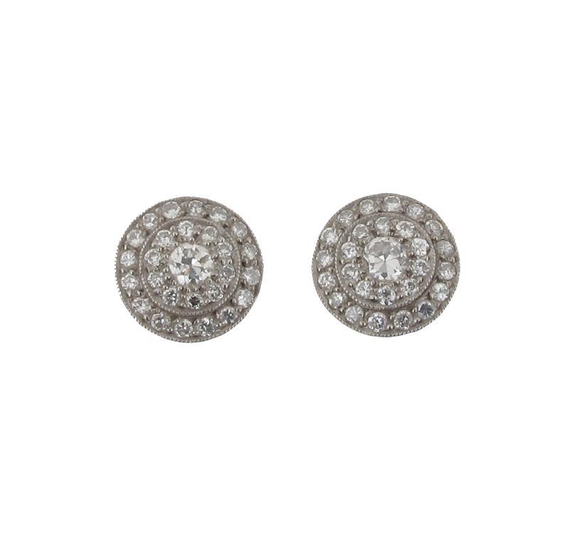 A pair of diamond cluster earrings, each circular cut diamond is millegrain set within two surrounds of smaller diamonds in white gold.
