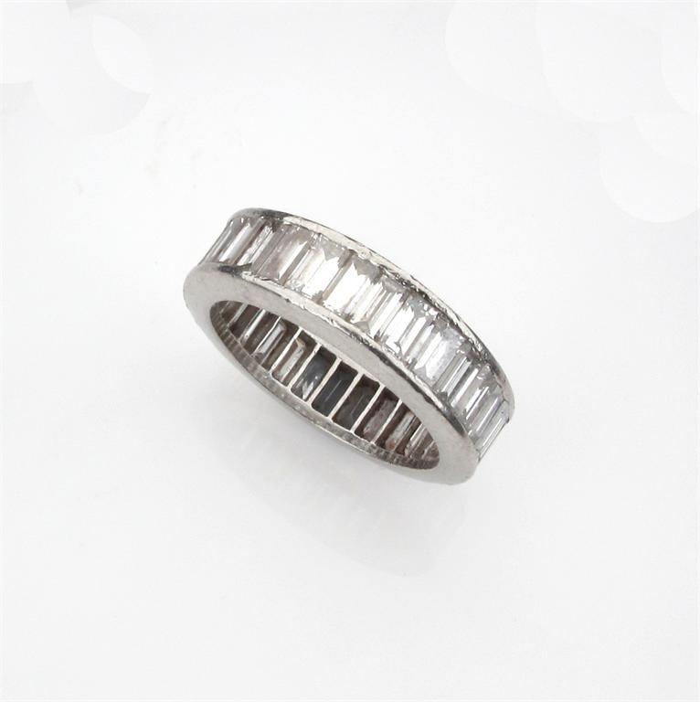A diamond full circle eternity ring, set with baguette shaped diamonds in platinum. Size I.