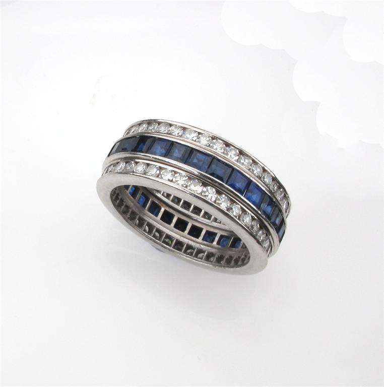 A diamond and sapphire full circle eternity ring, the centre row of calibre cut sapphires is set within borders of circular cut diamonds in platinum. Size M 1/2.