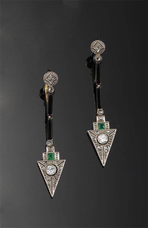 A pairn of Art Deco drop earrings, the diamond and emerald set arrow heads suspend from tow articulated sections of black onyx and further small diamonds. Platinum and gold.