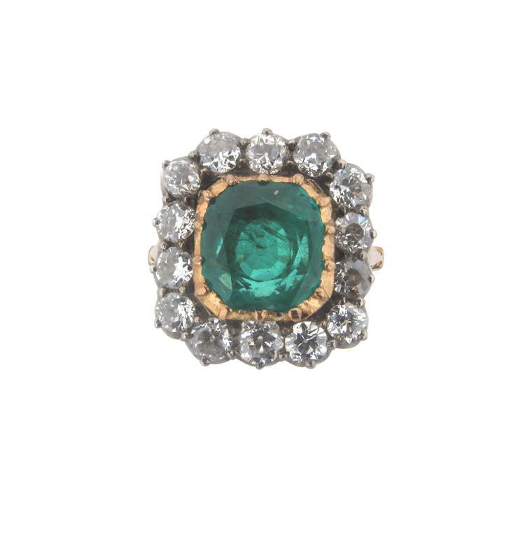 A late Victorian emerald and diamond cluster ring, the emerald is set within a surround of fourteen old circular cut diamonds in silver and yellow gold. Stylised fleur de lys shanks. Size N.