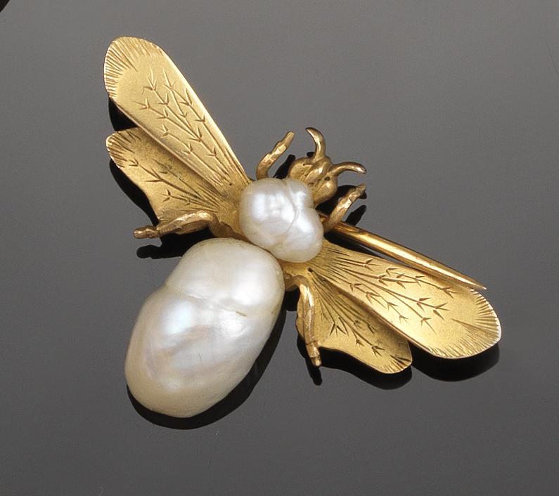 An Aesthetic gold and pearl bee brooch, the body formed with two baroque shaped pearls and realistically engraved wings. Stamped 15. 3.5cm wide. The largest pearl 13.7cm long.