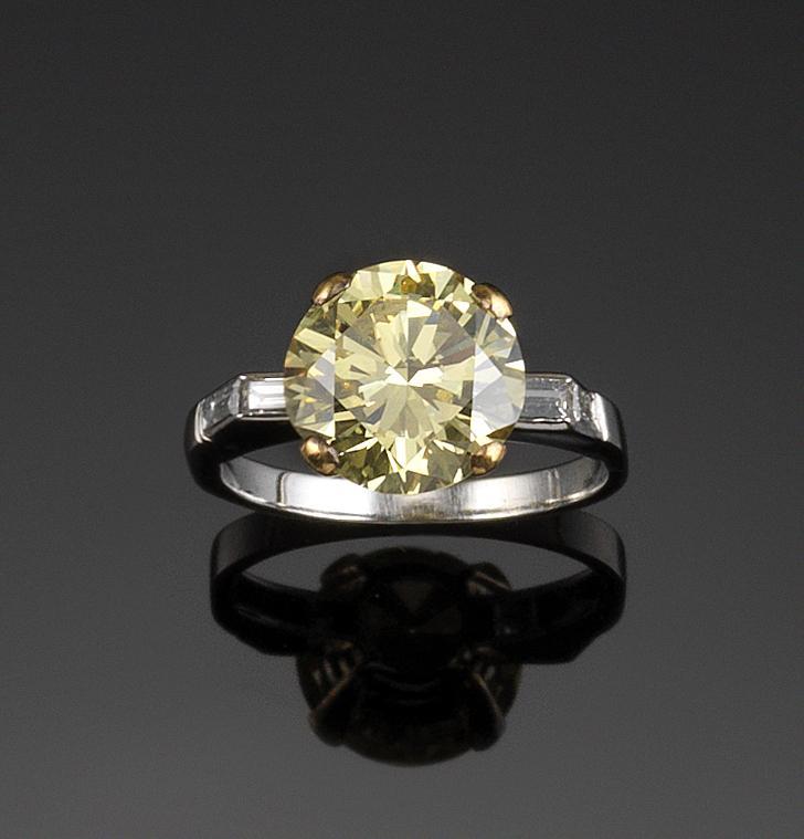 A fancy yellow solitaire diamond ring, the brilliant cut diamond weighs approximately 4.10cts and is set with four baguette shaped shoulder diamonds in white gold. Size N.