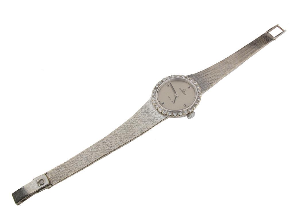 A ladies white gold wristwatch by Omega, plain signed oval dial with diamond set bezel and integrated white gold band. 16.5cm.