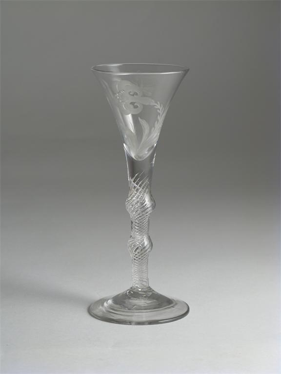 A good wine glass 2nd half 18th century, the flared bowl engraved with a hibiscus type flower, the reverse with a flying insect, raised on a double-knopped airtwist stem, 17.3cm.