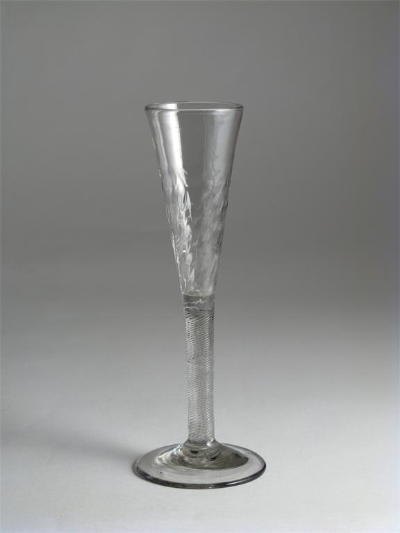 A good flute glass 2nd half 18th century, with tall wrythen bowl issuing from a multiple series airtwist stem, 20.5cm.