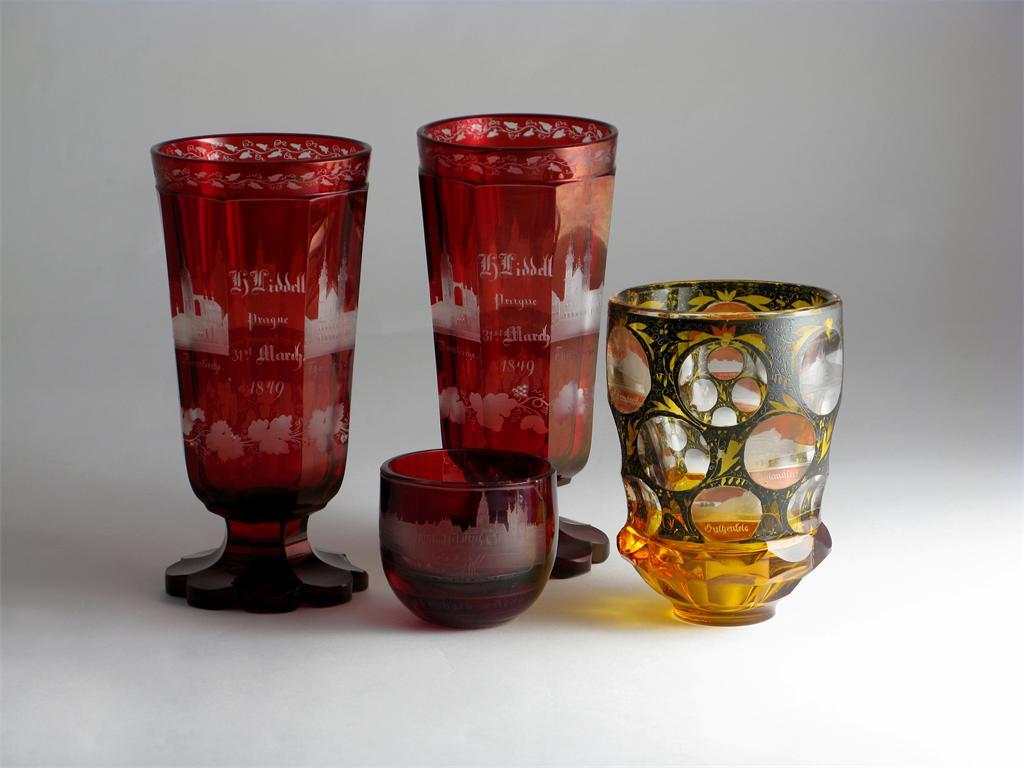 A pair of Bohemian ruby-flashed souvenir goblets dated 1849, the tall octagonal forms engraved with scenes of famous buildings in Prague, inscribed 'H Liddell Prague 31st March 1849', a similar small bowl, and a Bohemian amber goblet engraved with spa locations and titled 'Mrs Lawrence', the goblet's stem lacking, 19cm max. (4)
