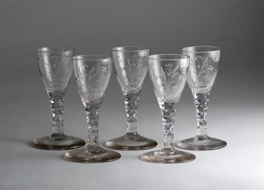 Five small wine glasses c.1780, each engraved with a spray of flowers, a bee to the reverse, raised on faceted stems, 12cm. (5)