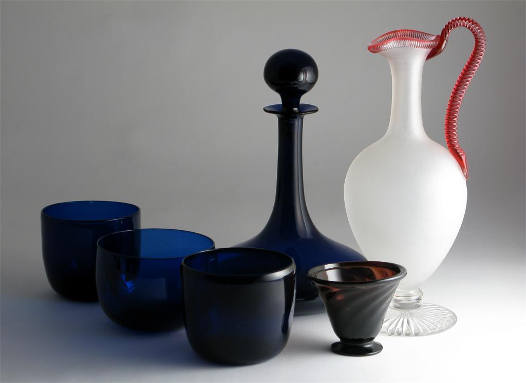 Bristol blue glass 18th / 19th century, including a decanter and stopper with traces of gilding, and three finger bowls, an amethyst spiral-moulded bowl, and a tall glass ewer with ruby-flashed faceted handle, 31.5cm max. (7)