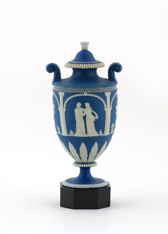 An English Jasperware two-handled vase and cover 1st half 19th century, perhaps Neale & Co., applied in white on blue with Classical figures between Corinthian columns, raised on a black octagonal base, 30cm. (2)
